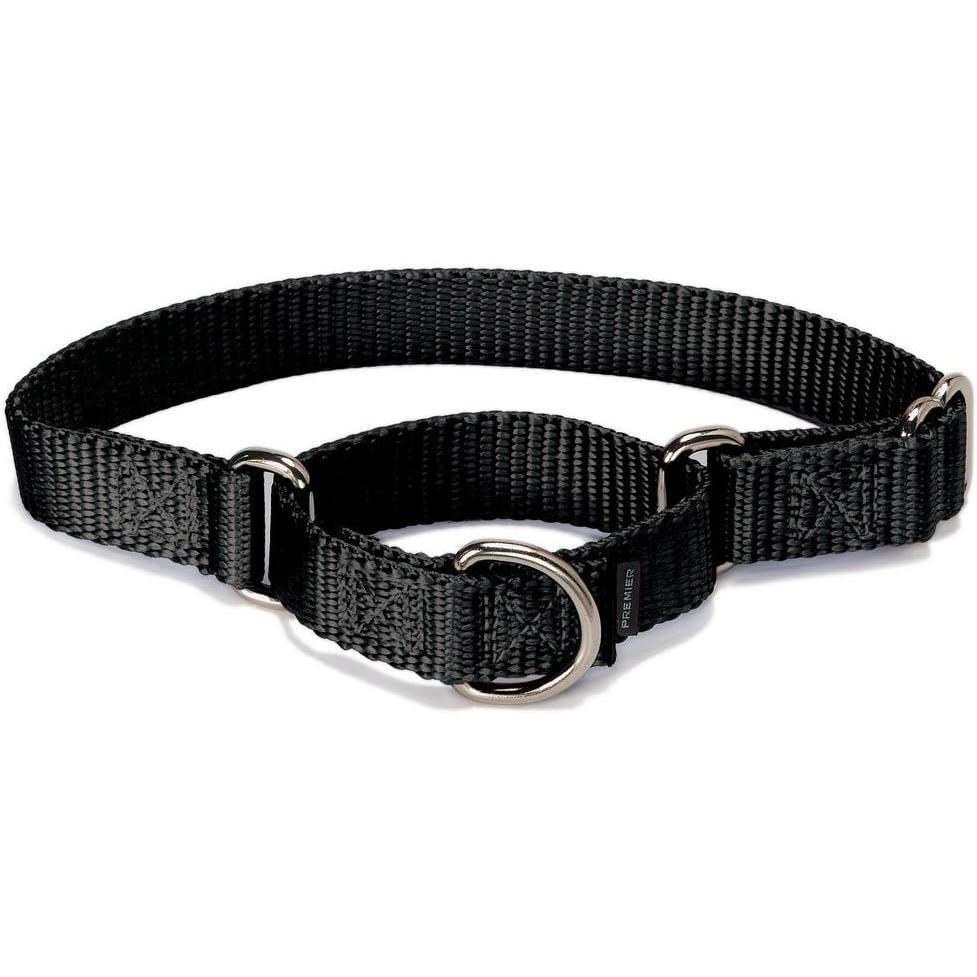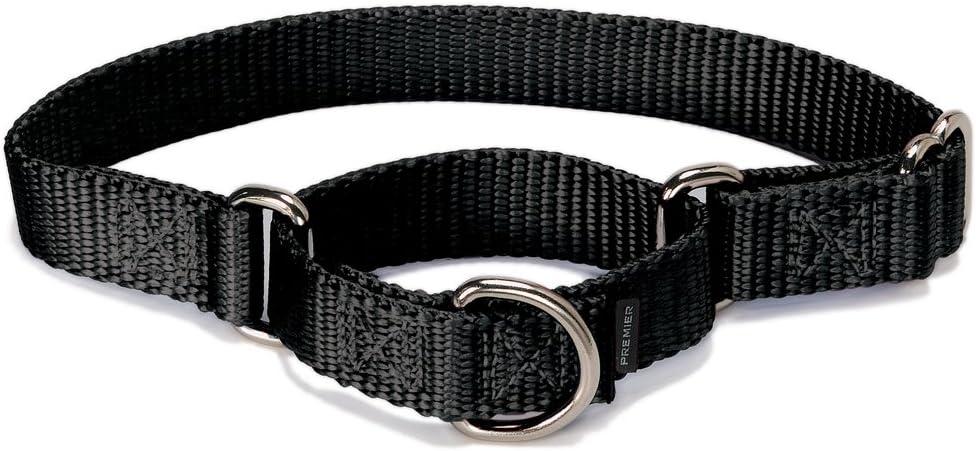 The Premier Collar “Your Dog's Neck's Best Friend”. With a leash or with your hand, the Premier collar tightens to give greater control and reduces the risk of escape. Because it offers limited closure, it's safer than a traditional choke collar . Unlike other collars, the measurement taken for the Premier Collar is at the top if the neck directly behind the ears. This corresponds with the size of the collar in the closed position, so it is not necessary to add inches. For example if your adult dog measures 14″ directly behind the ears, choose a medium collar. Sizing recommendations 5″-8″ Petite, 8″-12″ Small, 10″-16″ Medium, 14″-20″ Large, 18″-28″ Extra Large. Once you've selected the proper size, simply place the larger opening over your dog's head. Adjust to fit by pushing the nylon through the slide. When tightened with a leash or by grasping the smaller nylon loop like a handle, the two metal rings should touch directly behind your dog's ears. Attach tags to these rings rather than the D-ring. The smaller nylon loop will lie flat after few days of wear.