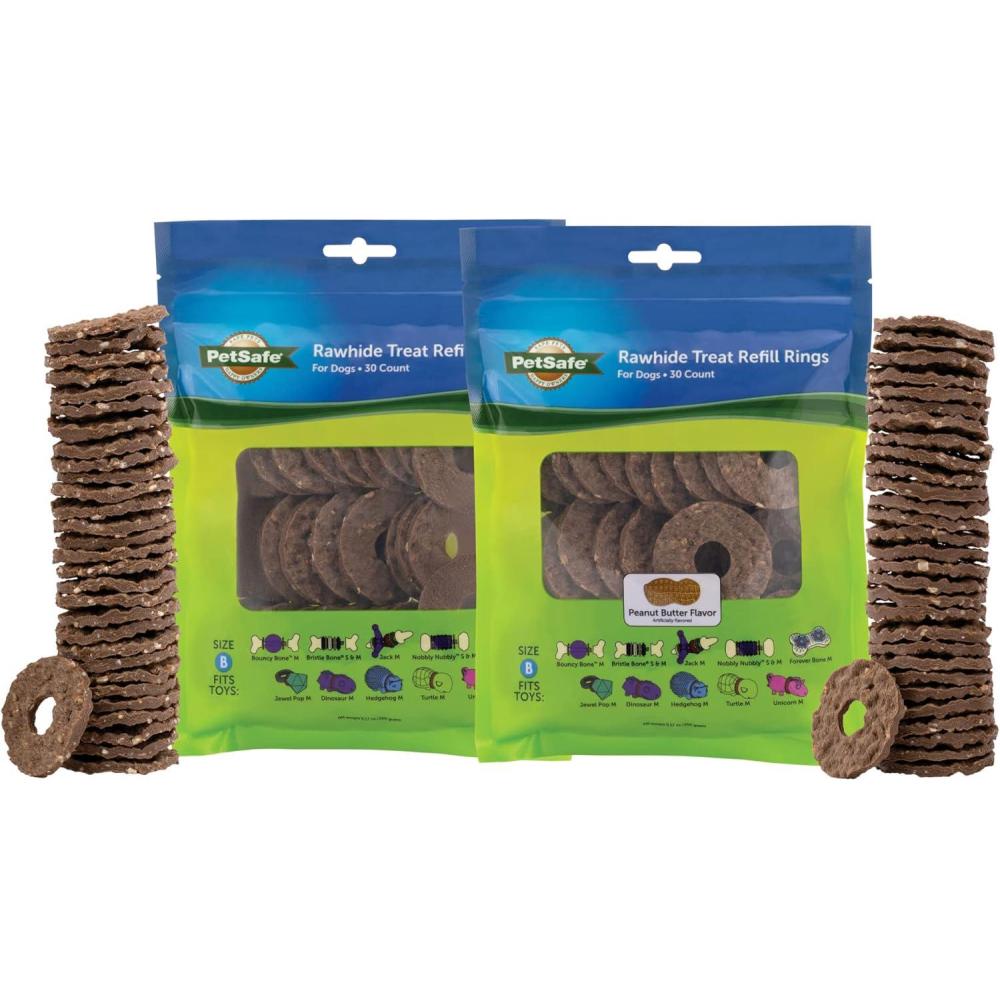 Unleash a world of flavor for your furry friend with these dog treat rings from the PetSafe Dog Treat Ring Variety Pack for Busy Buddy Toys. These treat rings for dogs are a blend of original rawhide and peanut butter flavors, sure to keep your pet intrigued and active. Engagement is the cornerstone of these dog products, with the rawhide treat rings serving as a fantastic reward post-training. These pet supplies not only reinforce good behavior but also extend your dog's playtime, ensuring they get the necessary physical activity for a healthy lifestyle. Convenience takes center stage with these small dog treats, packaged in an easy-to-open resealable bag from the PetSafe Dog Treat Ring Variety Pack. These puppy treats remain fresh and tasty, thanks to the resealable bag's convenience, allowing you to bring the treat rings anywhere. Tailor the treat size to your pet's needs with these dog treats for large breeds, available in three options – small, medium, and large. These puppy treats for training allow you to choose the size that best fits your pet's requirements, ensuring they derive maximum pleasure from their treat rings. Enjoy savings with these pet supplies for dogs, available through the PetSafe Dog Treat Ring Variety Pack subscription. This pet safe toy subscription offers monthly refills, saving you 5-15% each month, and ensuring your dog is always supplied with treat rings.
