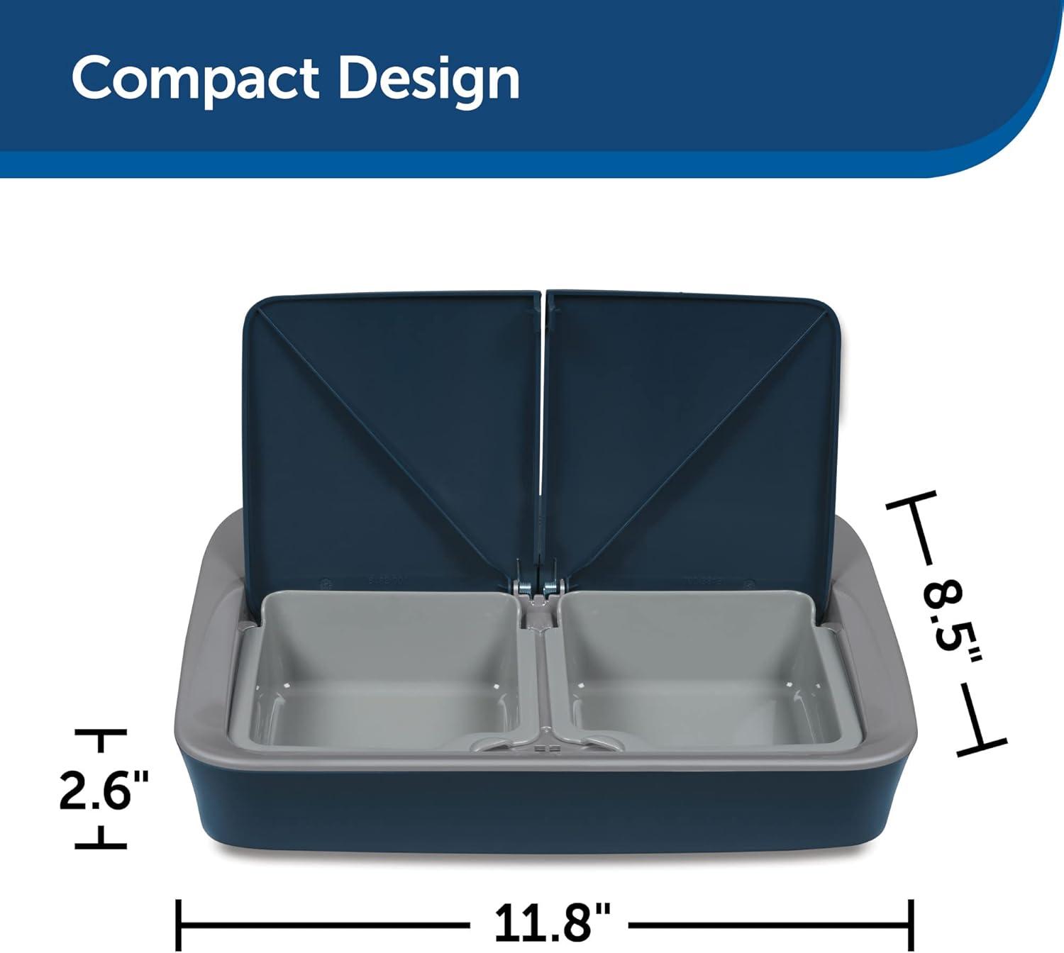 Serve dinner on time, every time with the PetSafe Digital Two Meal Pet Feeder. Use the digital timers to easily schedule 2 meals, up to 4 days in advance, in 1-hour increments. if it’s currently 8 a.m. and you’d like to feed your cat at 12 p.m., set one of the digital timers to 4, so your cat’s meal will be delivered at the desired time. Simply reset the timers anytime you want to schedule your pet’s meal. Each removable tray holds up to 1 1/2cups of dry or semi-moist food, snacks or treats. The lids on the feeder are recessed so prying paws won’t be able to get to their food ahead of schedule. The sleek, compact design of the feeder looks great anywhere in your home. When you need to clean your pet’s feeder, simply remove the trays and place them in the top rack of the dishwasher. PetSafe brand is here to help you and your pet live happy together.