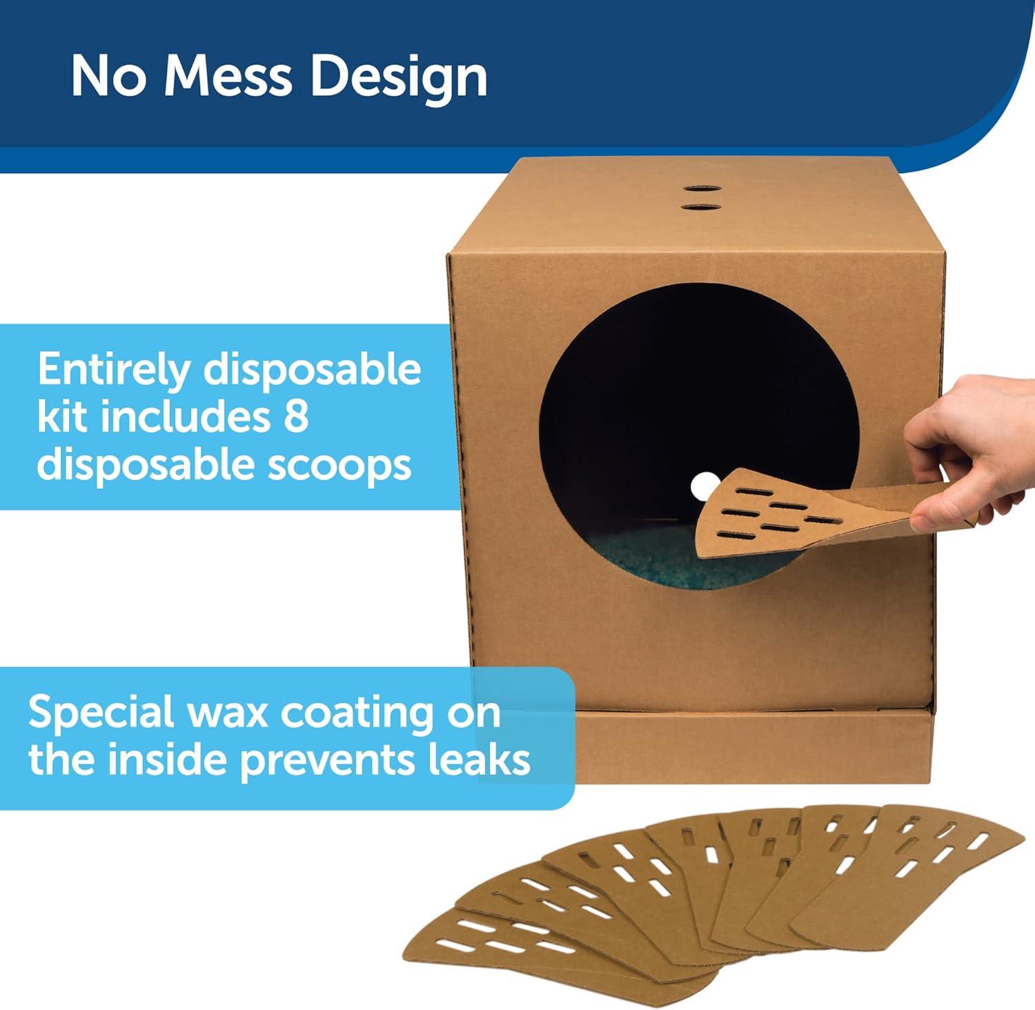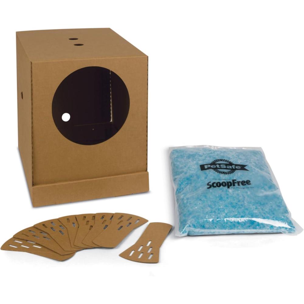 The PetSafe Disposable Litter Box is made of durable corrugated cardboard. The compact litter box easily pops up and folds back down for travel convenience. The box comes with a bag of crystal litter which absorbs urine and dries solid waste for 5x better odor control than clumping clay litters. The protective coating on the box protects against leaks while the box nests snuggly in the lid for extra protection. Whether youre moving or taking your pet on vacation, this litter box is a convenient potty solution for a pet on the move. PetSafe brand is here to help you and your pet live happy together.
