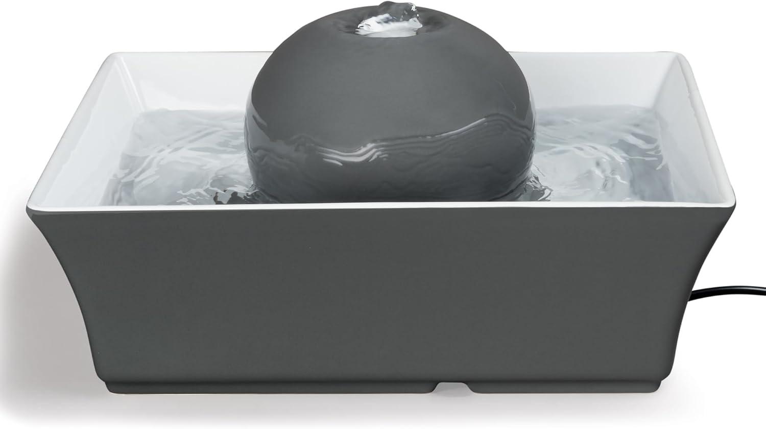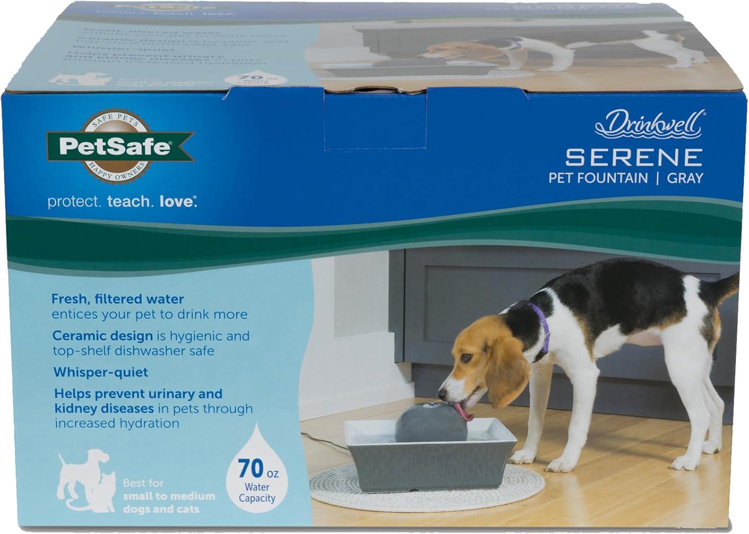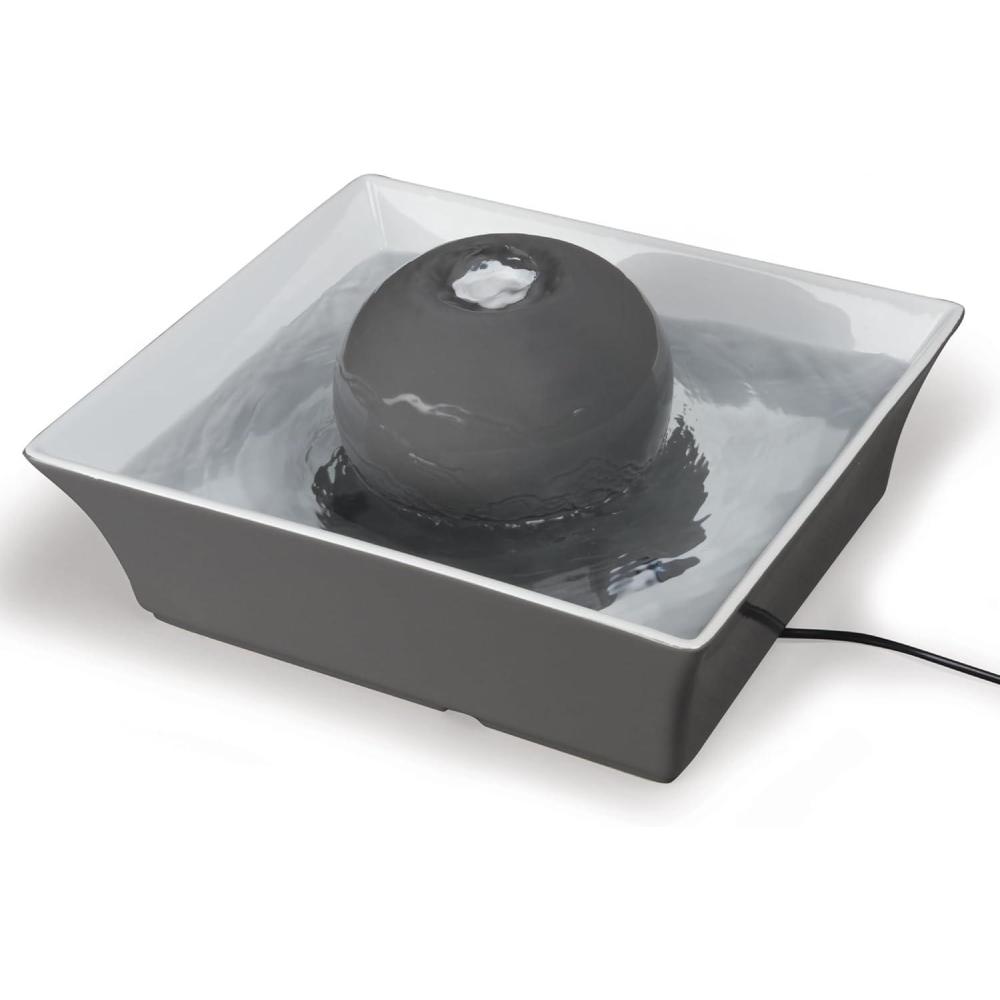 The PetSafe Drinkwell Seascape Pet Fountain provides 70 ounces of fresh, filtered water. The low-voltage, submersible pump constantly circulates the water, keeping it clean and appealing to pets. The soothing flow of water is extremely quiet, making it easily approachable. The gray ceramic design is easy to clean and top-shelf dishwasher safe. The Seascape Pet Fountain not only fits seamlessly with modern home decor, but it also keeps pets healthy and hydrated.