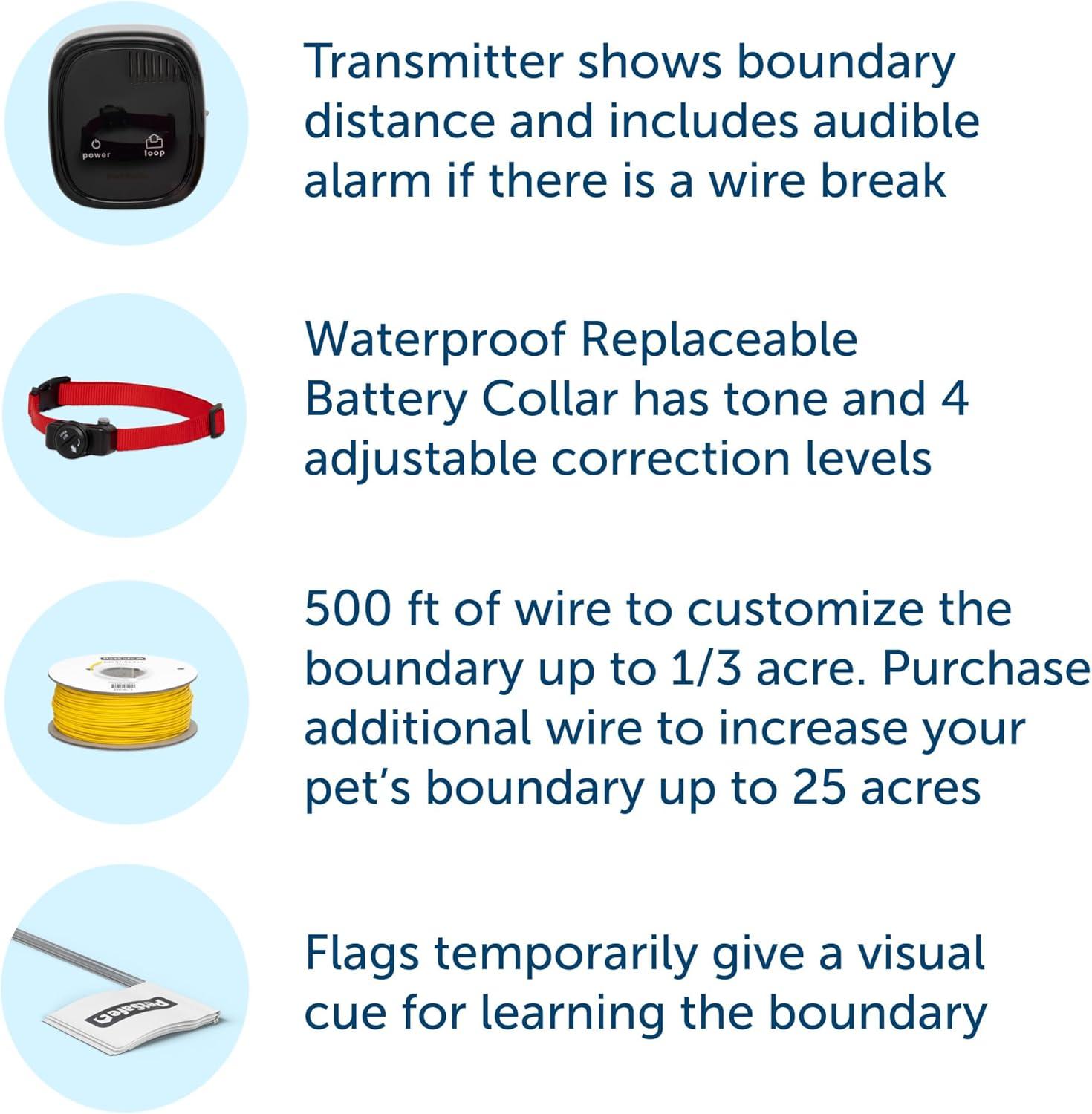 SAFE AND CUSTOMIZABLE: Gives your pets room to play with up to 1/3 of an acre coverage, expandable up to 25 acres with the purchase of additional wires and flags (sold separately)