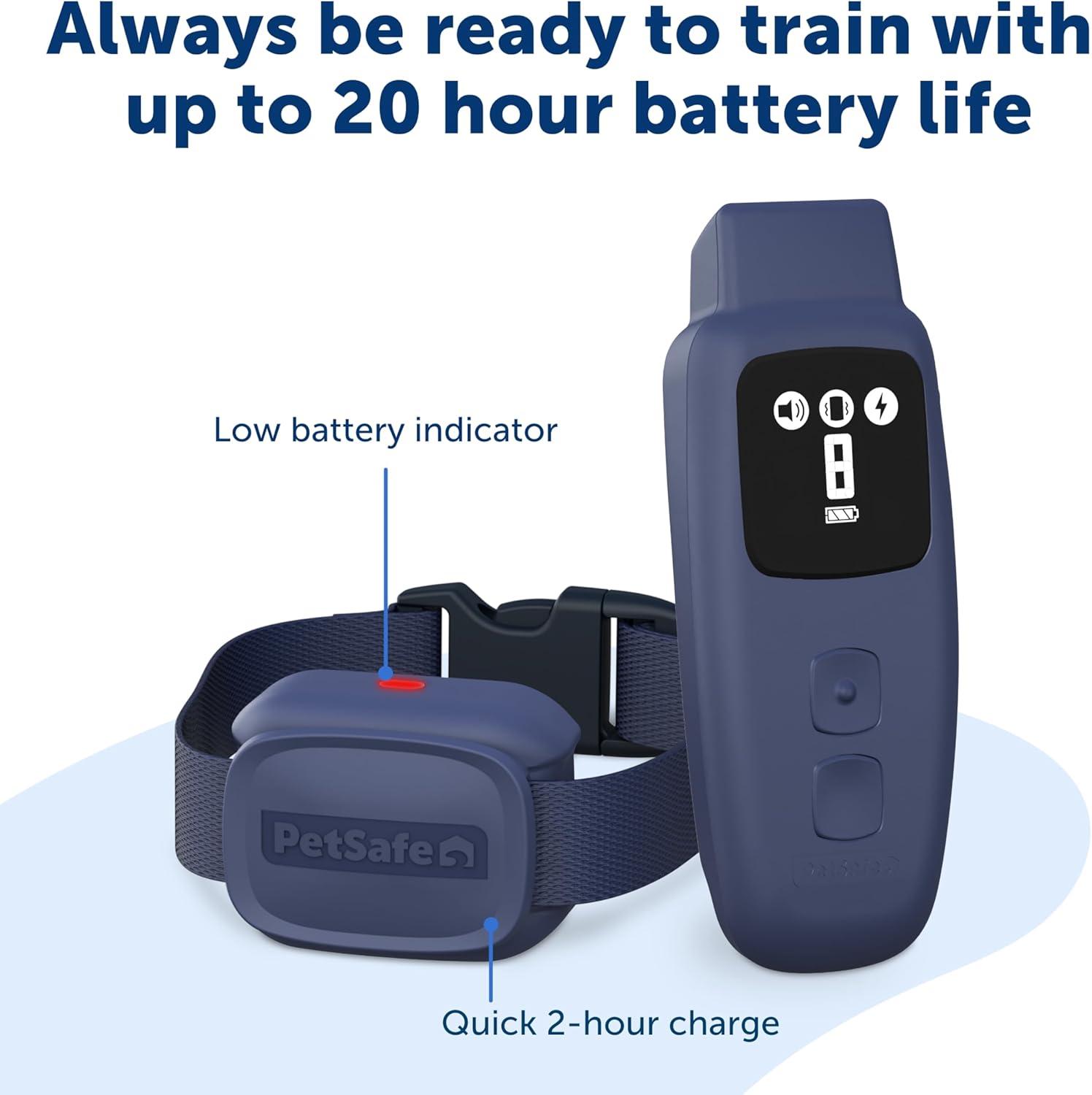 Strengthen the bond between you and your dog with the PetSafe Pro Dog Trainer, an effective static training collar that works like a light tap on the shoulder to get your dog’s attention and gently nudge them towards better behavior. Use one of three distinct training modes including tone, vibration and 19 levels of static, to communicate behavior modifications with a reliable and safe method. Teach your dog to obey commands, display better household manners and develop enough control to enjoy more off-leash freedom. With a range up to 1000 feet, the PetSafe Pro Dog Trainer is ideal for building a better connection between owner and dog on outdoor adventures like hiking, playing in open fields or exploring the woods. It can also be used to build better behavior in short-range situations like at-home or backyard training. Rechargeable and waterproof with a sleek design, the static dog collar is easy to use and helps keep your dog safe. Trusted and recommended by both veterinarians and trainers for 25 years, our static dog collar will help your pet go from a good dog to a great dog.