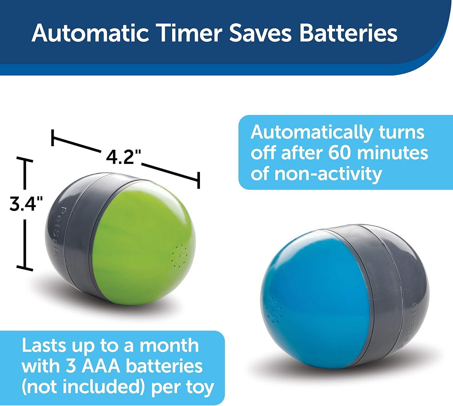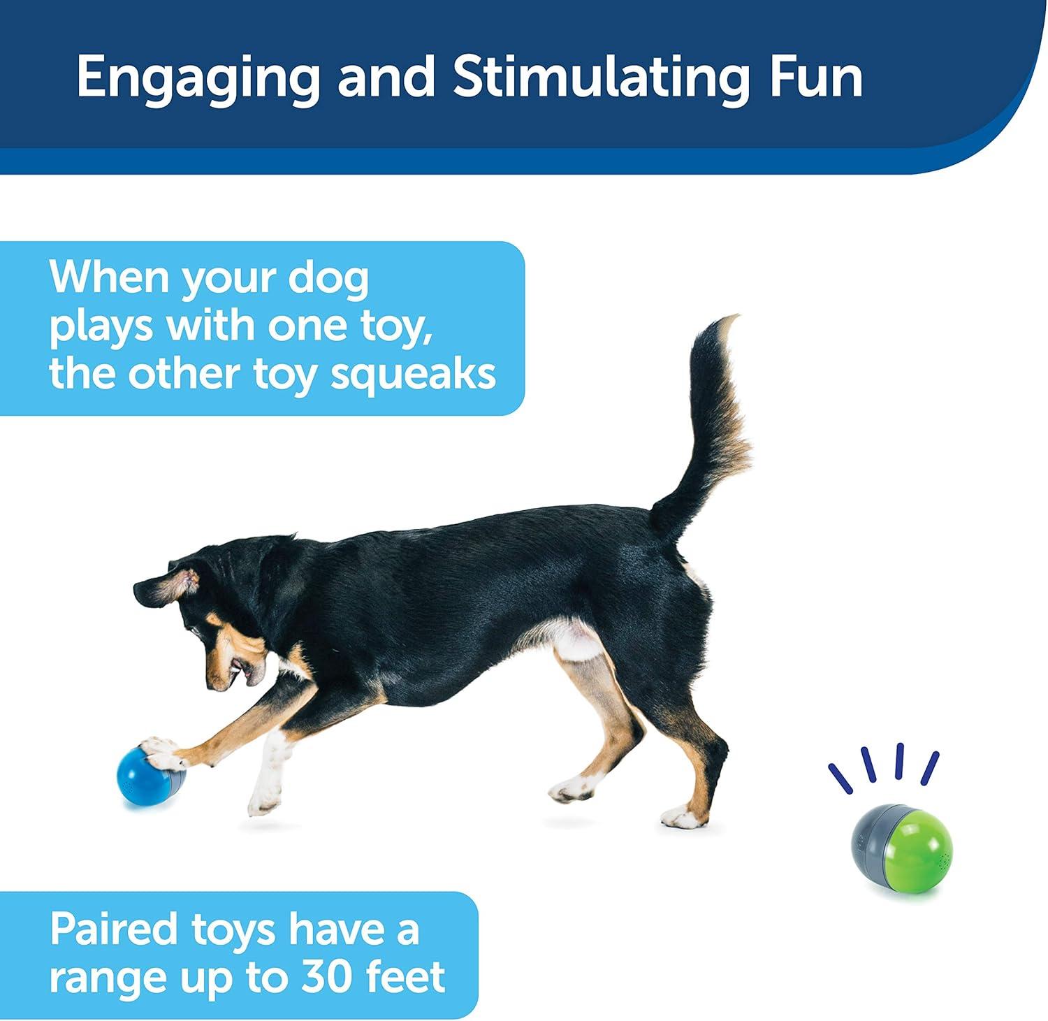 STIMULATING EXERCISE: When your dog interacts with one of the toys, the other toy emits an automatic squeak from up to 30 feet away which keeps your dog engaged