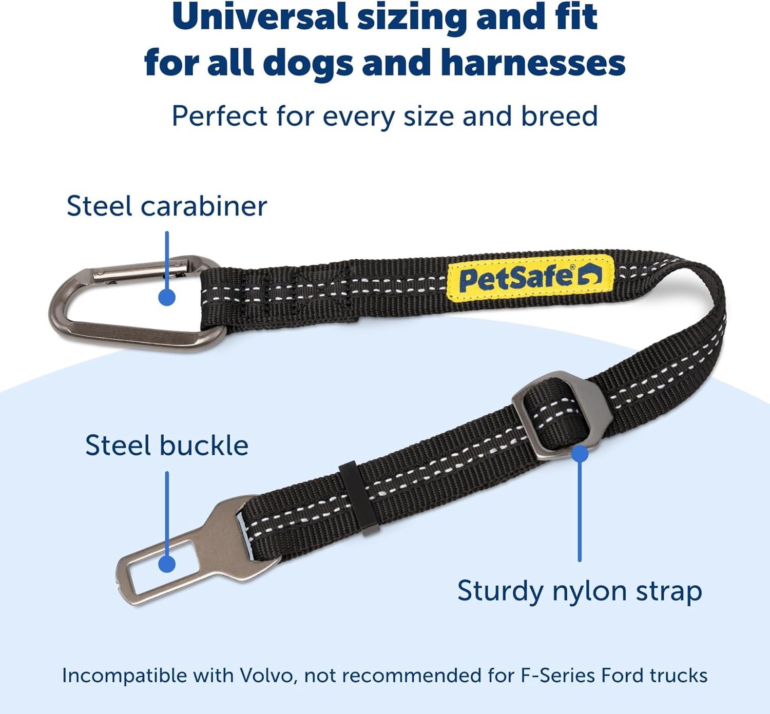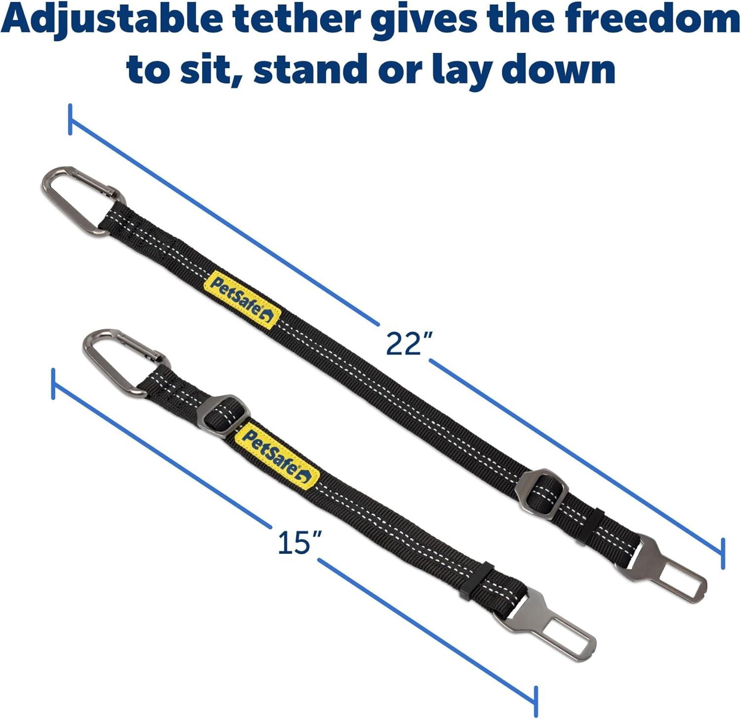 Reduce distracted driving while keeping your dog safe inside your vehicle with the PetSafe Safety Seatbelt Tether. Whether your furry traveling companion has anxiety, attachment behaviors or is just excited to play, the seat belt tether for dogs prevents them from jumping into your lap while youre driving. The adjustable dog seat belt length can be extended from 15 to 22 and allows your dog the freedom to stand, sit or lie down in the back seat. Easy to install and made with a sturdy nylon strap, the PetSafe Safety Seatbelt Tether attaches to the slot end of your seat belt. When your dog hops in, simply attach the opposite end to his harness via the carabiner, and off you goyour dog safely in the back, and you in the drivers seat. Keep out of reach of children.