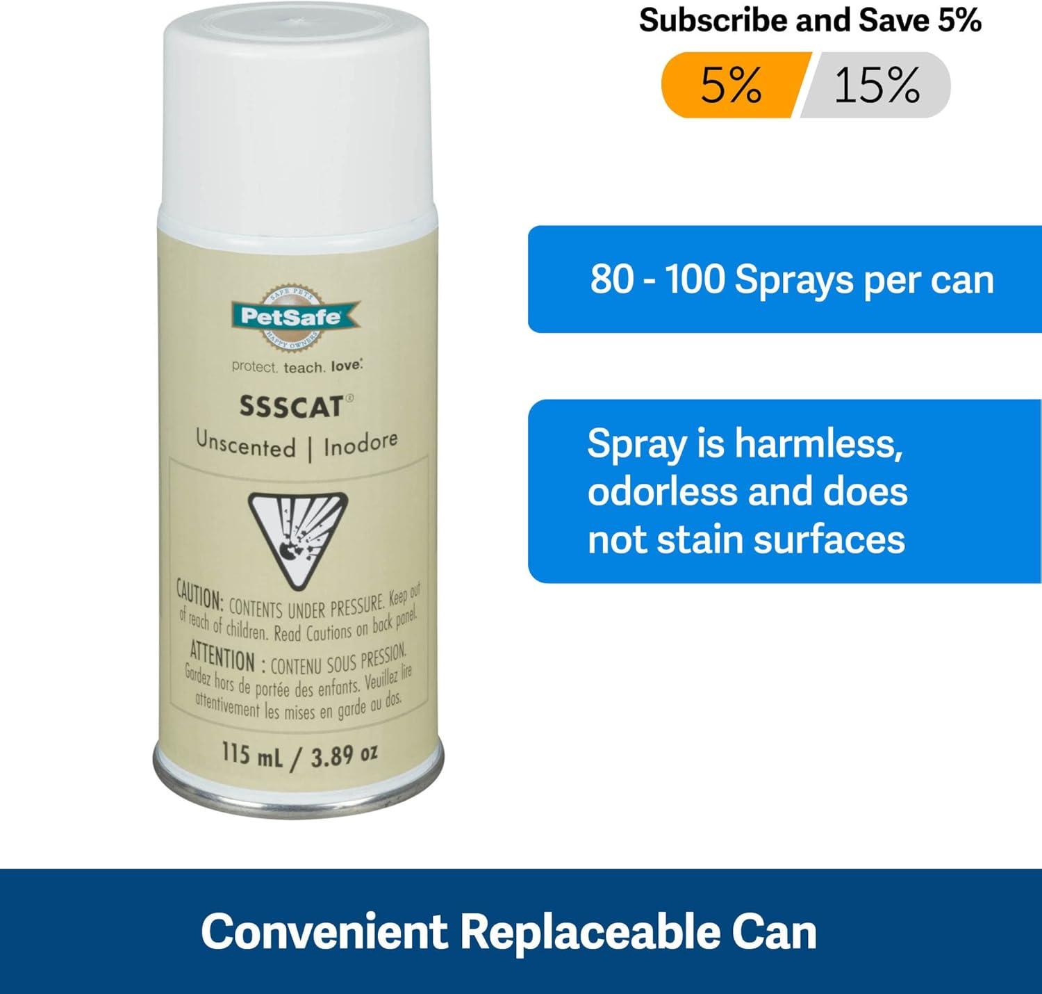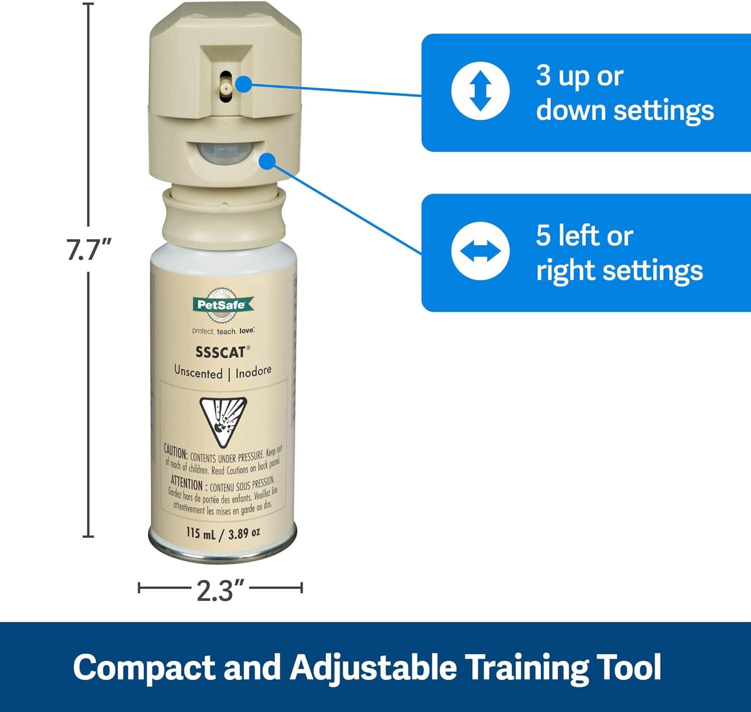 Say goodbye to shredded furniture and messy countertops with the PetSafe SSSCAT Automatic Spray Pet Deterrent. This motion-activated training tool provides a gentle, odorless air burst when your pet enters an off-limits area, teaching them where they shouldn’t go—without you having to be there to enforce the rules. The built-in motion sensor detects movement from up to 3 feet away, making it ideal for use around kitchen counters, trash cans, furniture, or any spot you want to keep pet-free. Each unit is powered by a quiet, quick-acting system that delivers up to 120 harmless sprays per can. It's a great way to set boundaries with your dog or cat without physical correction, yelling, or complicated training routines. The spray is completely safe for pets and won’t leave stains on your furniture or floors. SSSCAT is a non-toxic cat repeller and indoor boundary solution that works across multi-pet households. Whether you're addressing trash can raids or deterring sofa scratching, this device offers a safe, consistent way to keep your pet on their best behavior. Since 1988, PetSafe has been driven by a simple belief: safe, healthy pets lead to happier lives for pets and their families. For over 25 years, we've been dedicated to enhancing the lives of pets and the people who love them, treating every pet as a cherished family member and delivering life-changing innovations designed to enrich every moment. With U.S. roots and a global reach, our vet- and trainer-recommended products are built for every pet and backed by exceptional customer support. From backyards to dog parks, we're on a mission to create fields of joy for happy, healthy, and safe pets.