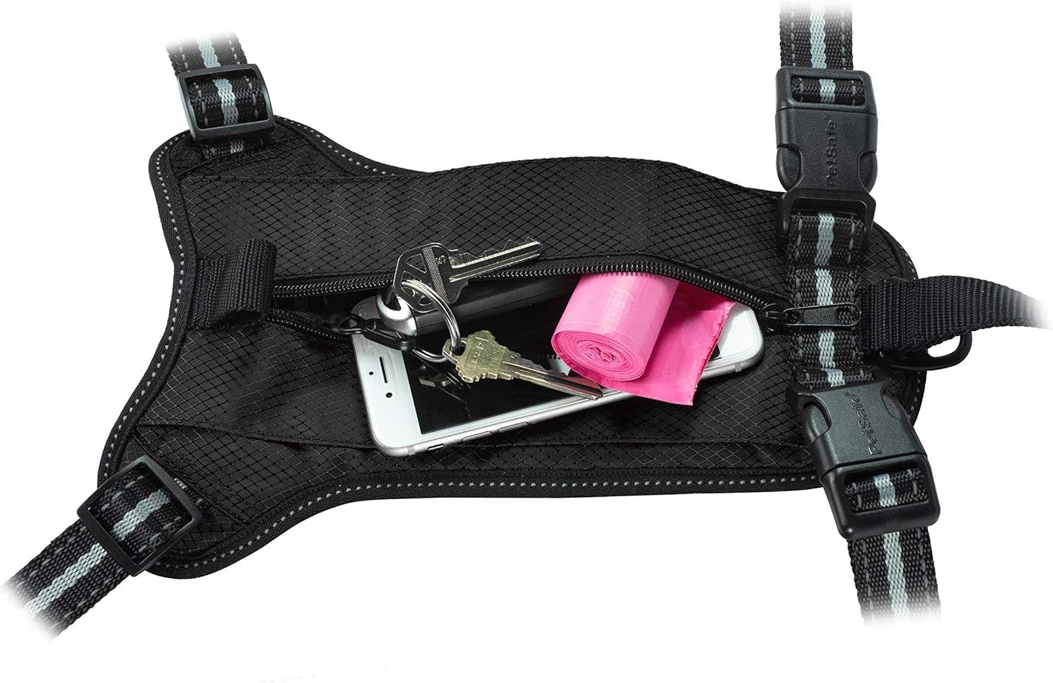 STORAGE: The zippered pouch on top of the harness allows you to store essentials like your wallet, car keys, phone or poop bags