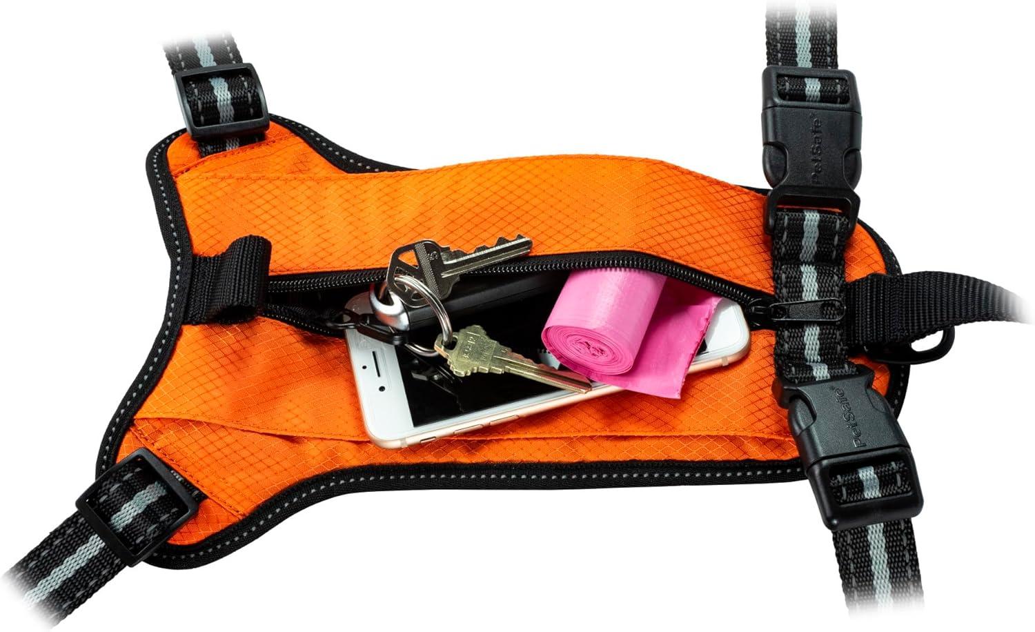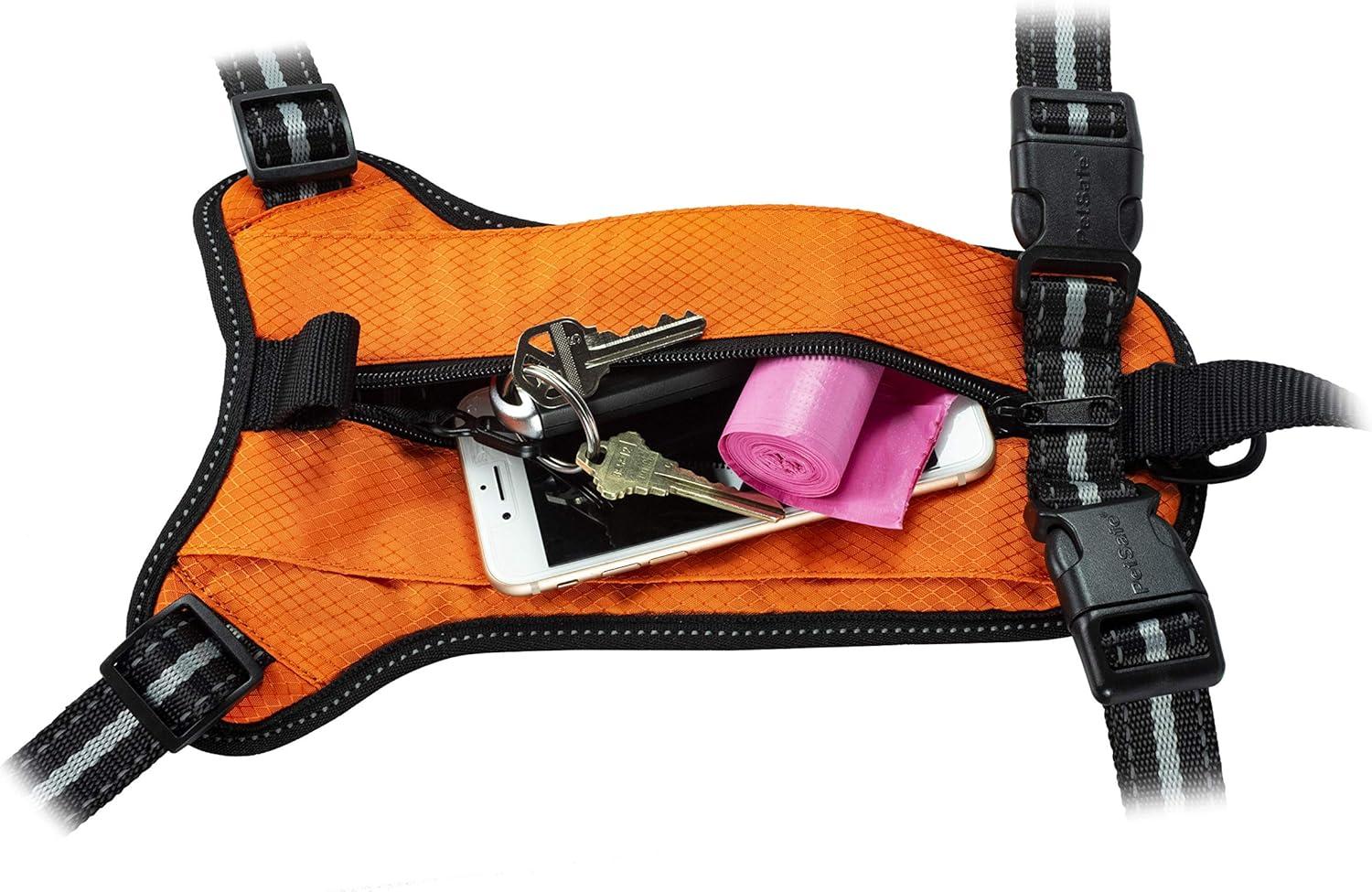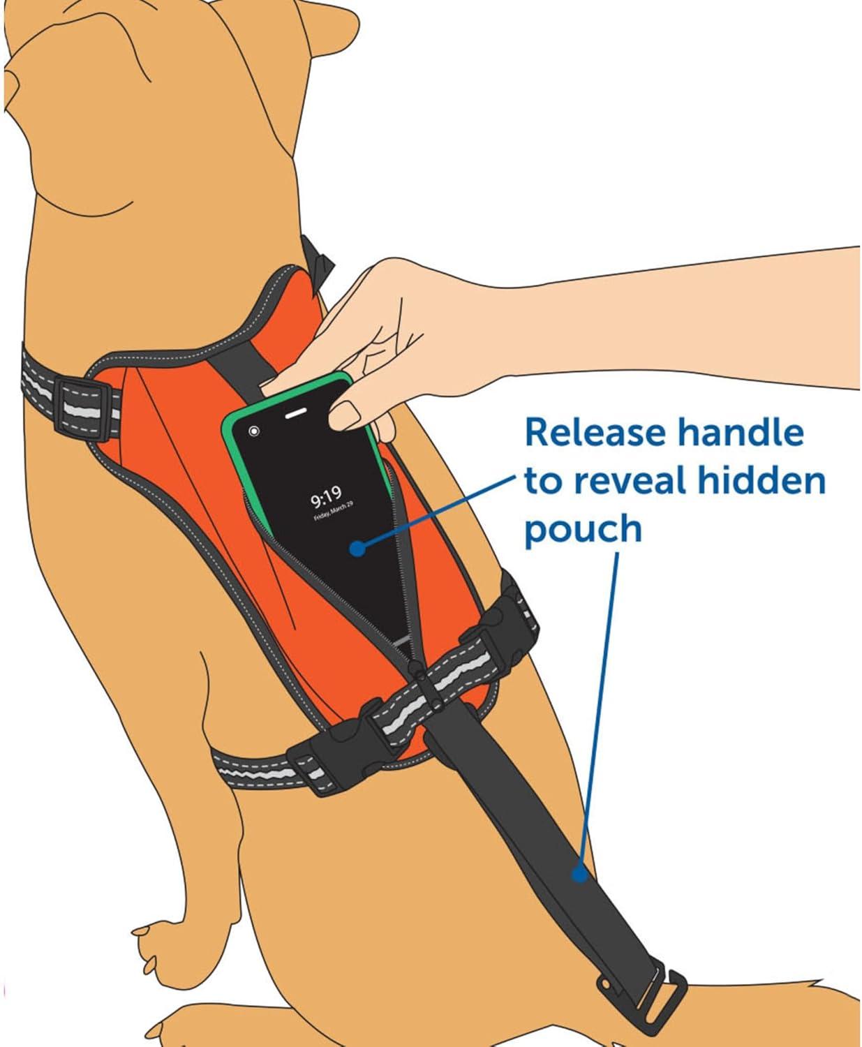 STORAGE: The zippered pouch on top of the harness allows you to store essentials like your wallet, car keys, phone or poop bags